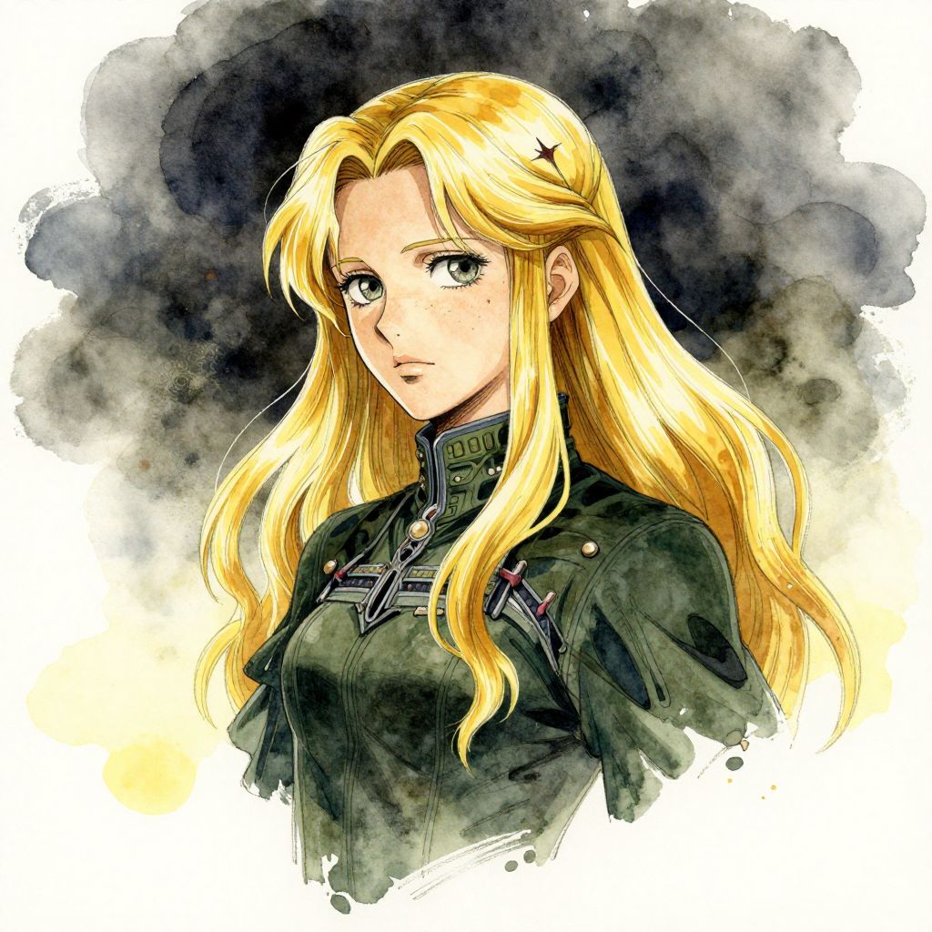 This digital anime-style drawing depicts a blonde woman with long, flowing hair and blue eyes, wearing a dark green military-style uniform with intricate patterns and buttons. Her expression is serious and focused. The background is a watercolor-like blend of dark gray and black, contrasting with a bright yellow glow behind her head. The artwork uses bold lines and vibrant colors, emphasizing her determined look and detailed uniform. The style is reminiscent of classic anime character designs, with a focus on realistic hair texture and expressive eyes.