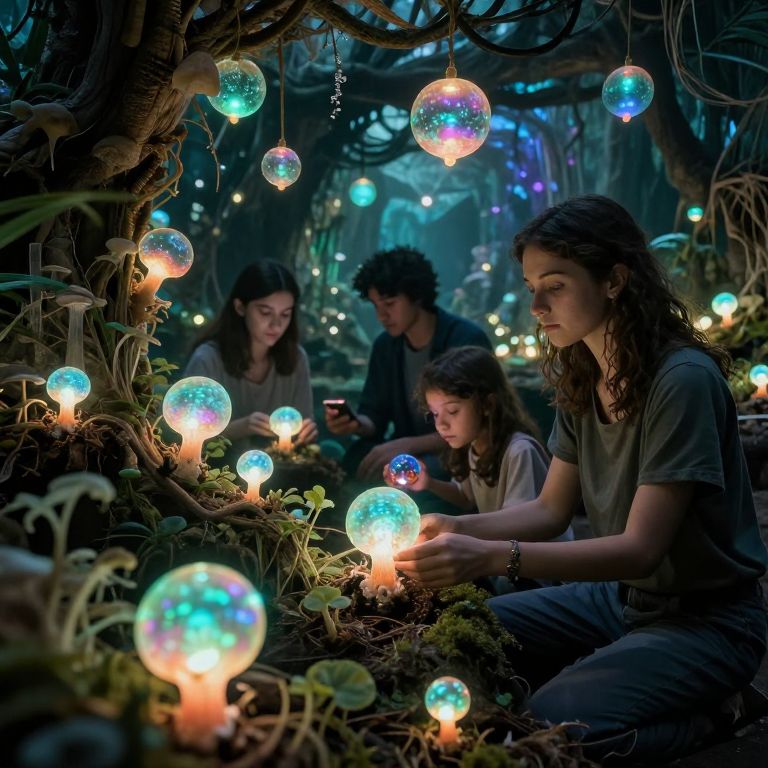 Photograph of three young people with wavy brown hair in a dimly lit, enchanted forest. They sit on moss-covered ground surrounded by glowing, iridescent bubble lights and small, luminescent mushrooms. The group, dressed in casual dark clothing, is focused on the bubbles. Twisted tree branches and foliage frame the background, adorned with additional blue and white lights. The scene is magical, with a mix of natural textures and ethereal lighting, creating a whimsical, fairy-tale atmosphere.