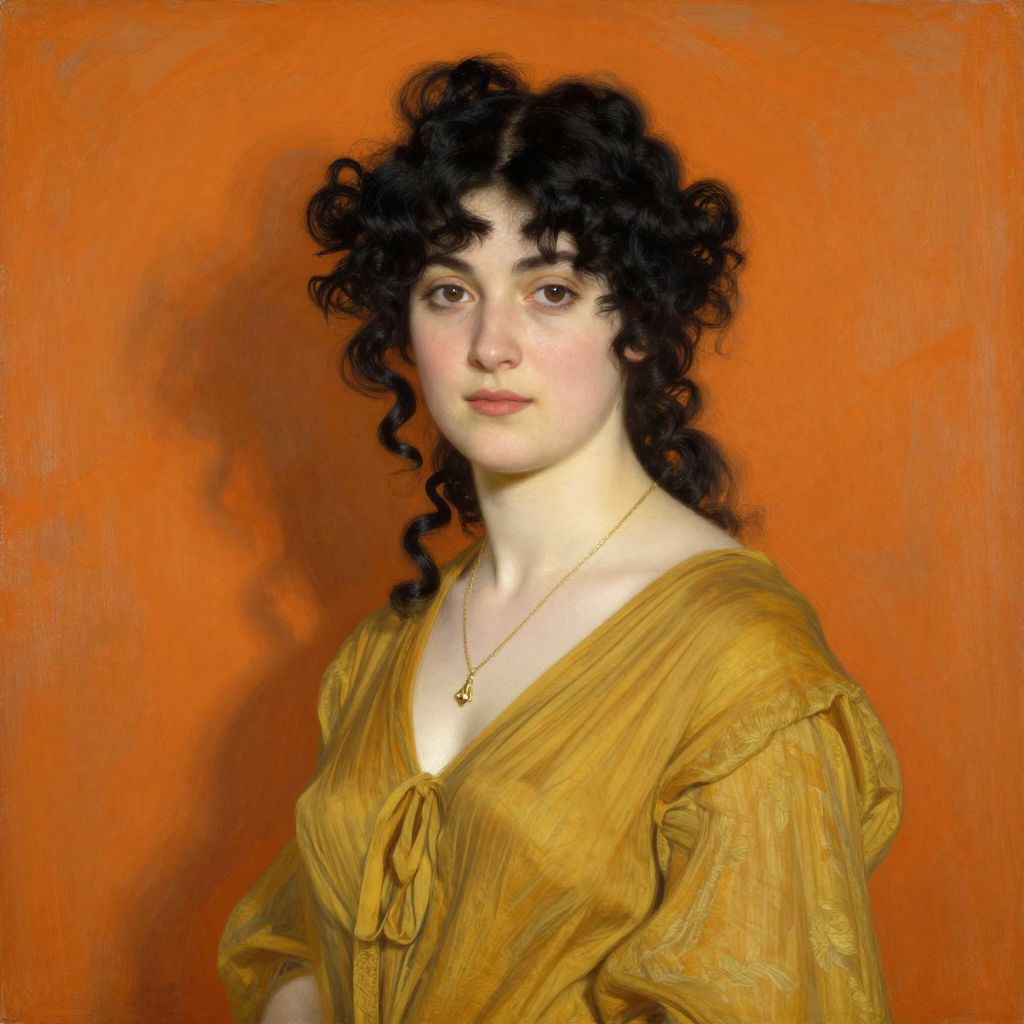 This is a digital painting of a young woman with pale skin and dark, curly hair, set against a vibrant orange background. She has large, dark eyes and a slightly flushed complexion. She is wearing a loose, golden-brown, V-neck dress with long sleeves, and a delicate gold necklace with a small, round pendant. The texture of her dress is slightly rough, and her hair is voluminous with soft curls framing her face. Her expression is neutral, and she is positioned slightly to the left, looking directly at the viewer. The overall style is realistic with a classical influence, reminiscent of 19th-century portraiture.
