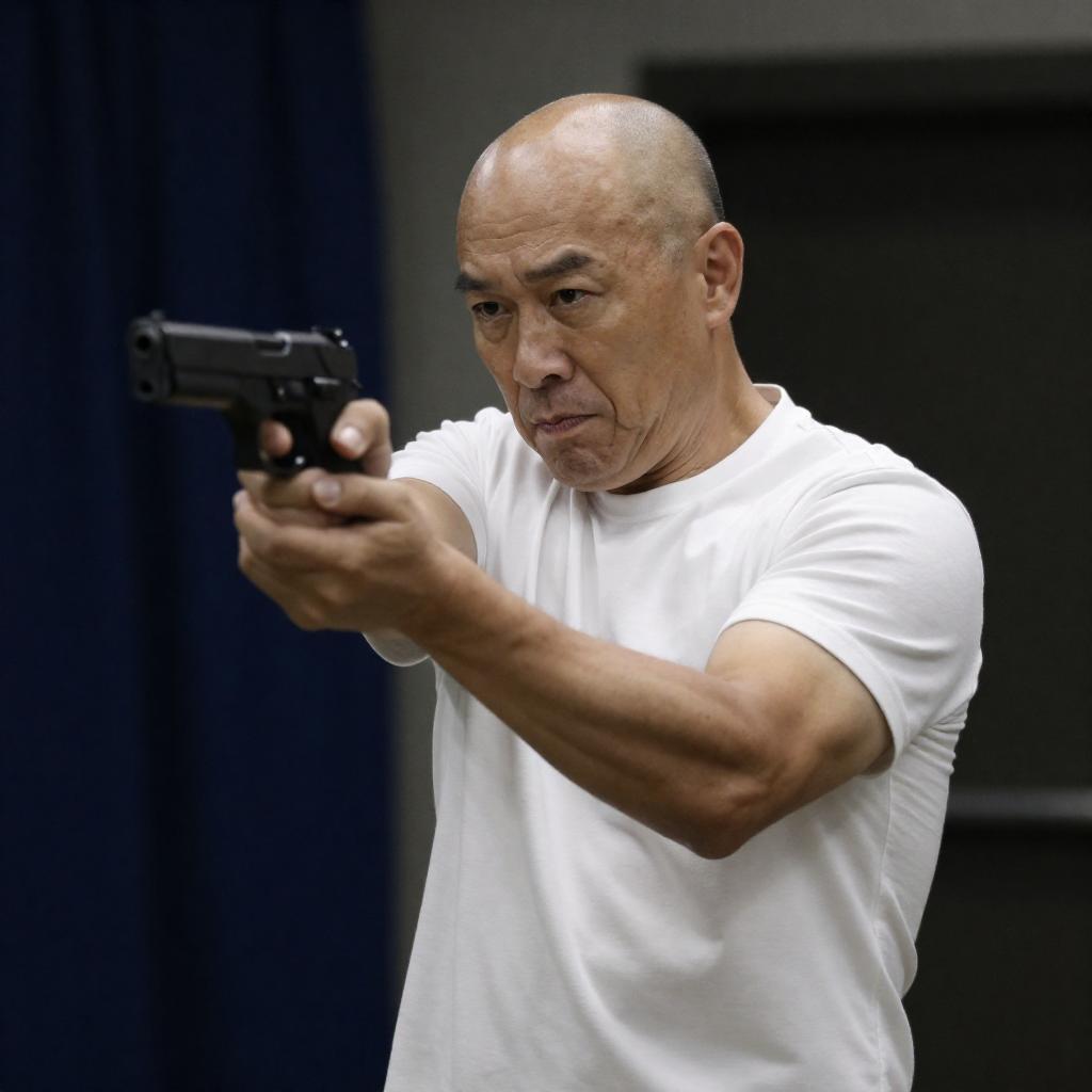 Photograph of a bald, middle-aged man in a black suit, holding a handgun and aiming it forward. Bright, blurred lights in the background create a dramatic effect. He has a serious expression and a cross necklace hangs from his jacket. The setting appears industrial with metal structures and dim lighting.
