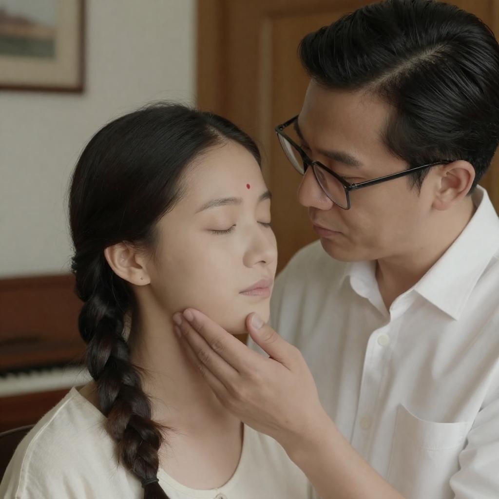 Photograph of a man and woman. Woman with dark hair, light skin, and striped shirt, holding a syringe, looks up with slightly open mouth. Man with short dark hair, light skin, shirtless, has hand around her neck, looks down at her. Dimly lit background. Woman's expression is slightly intense.