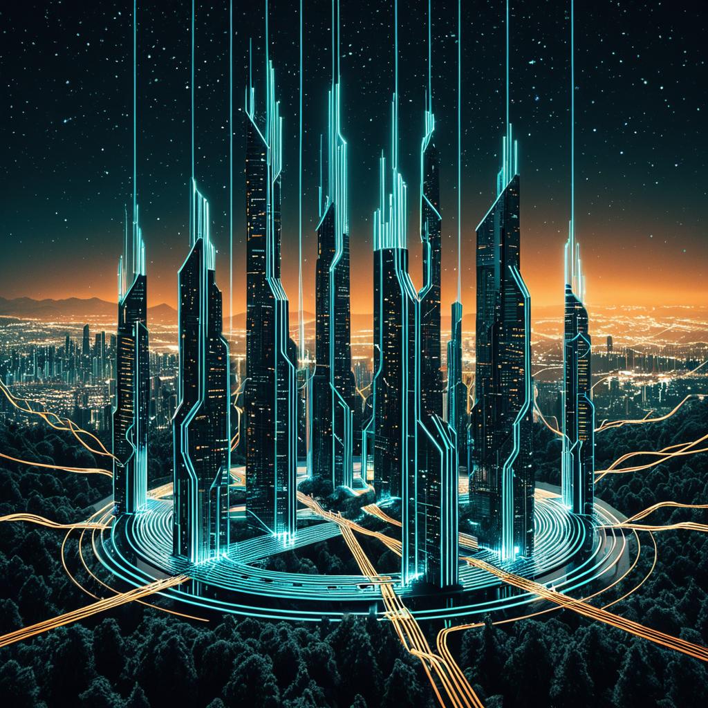 Artwork of bitcoin logo reimagined as a futuristic cityscape, organic metallic towers shaped like intertwining strands of the logo, luminous circuits flowing like veins, set against holographic forest of a corporate cyber-megapolitan expanse under a luminescent sky, vibrant and dynamic