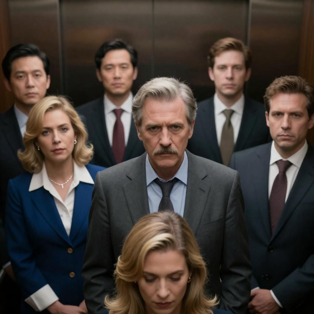 Photograph of five people in a room. Central figure, middle-aged man in dark suit, striped tie, hands on hips, standing behind a wooden railing. Two men on left, one with beard, other with brown hair. Woman with curly hair on right. American flag on right. Roll-up garage door in background. Intense expressions.