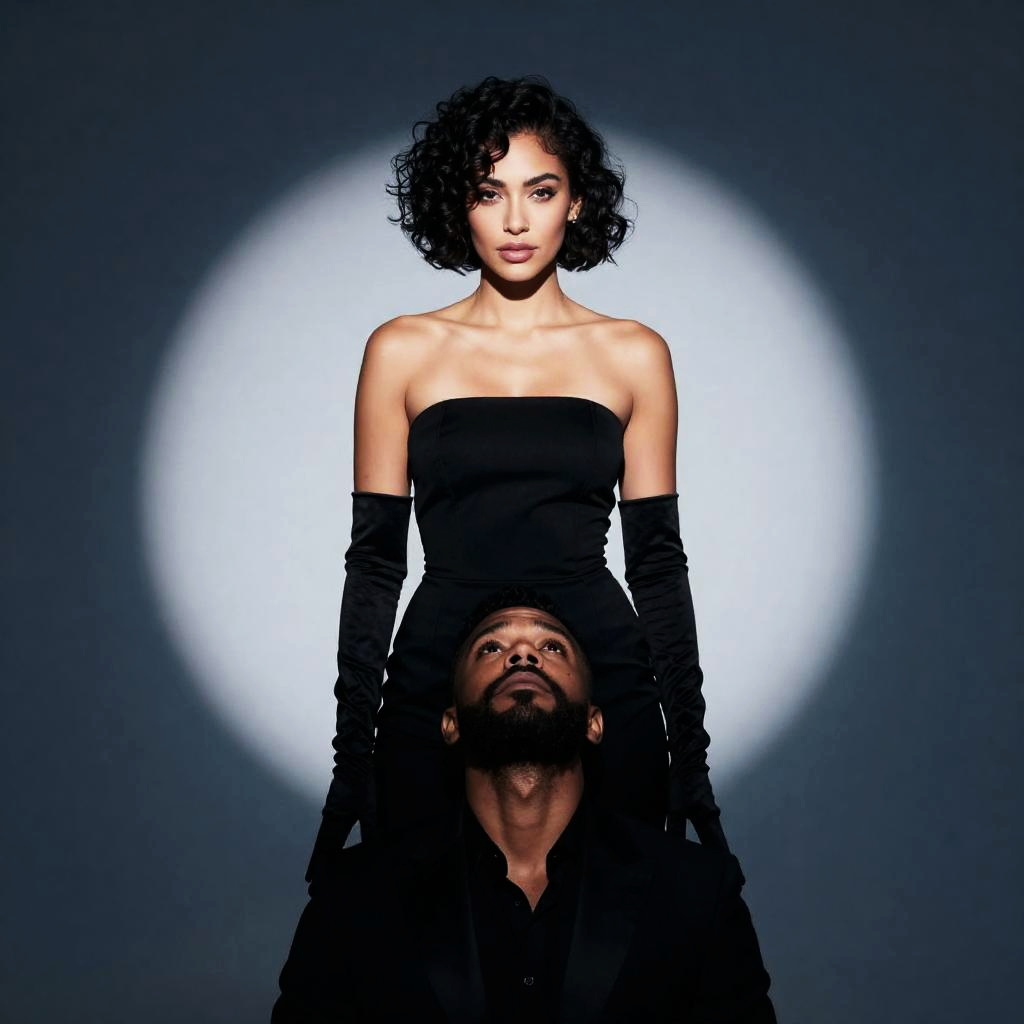 Photograph of two people in dim, yellow-orange lighting. Muscular man with dark skin, bare back, and extensive tribal arm tattoos faces right. Woman with light skin, curly hair, and intense gaze looks over his shoulder. Background includes blurred, abstract shapes and warm light. Man's profile in shadow, woman's face partially lit. Smoke-like yellow-orange overlay across image.