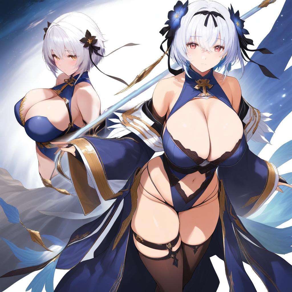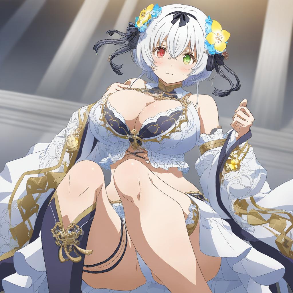 Alicia renato (yashiro sousaku), original, 1girl, heterochromia, red eyes, yellow eyes, hair between eyes, short hair, white hair, crossed bangs, hair flower, hair ribbon, huge breasts, large breasts, cleavage, thighs, navel, skindentation, bare shoulders, by artist henyaan (oreizm), animagine