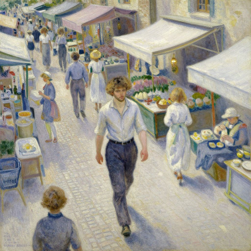 Impressionist watercolor painting by claude monet, surrealist aerial view of curly headed tan man walking through crowded market on cobblestone street by dean ellis