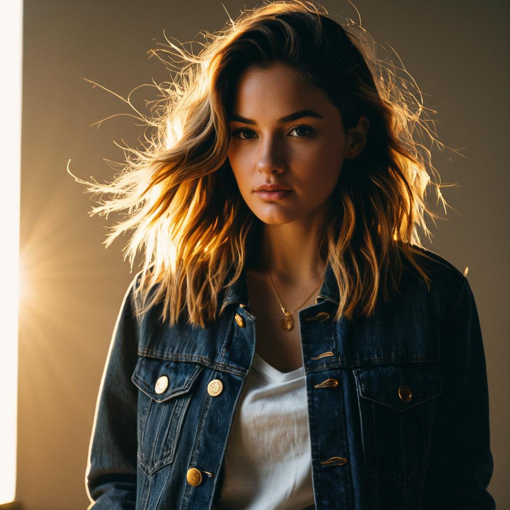 Root Smudge hairstyle on woman, wearing casual jacket, in studio, captured in fashion editorial style with golden hour backlight.