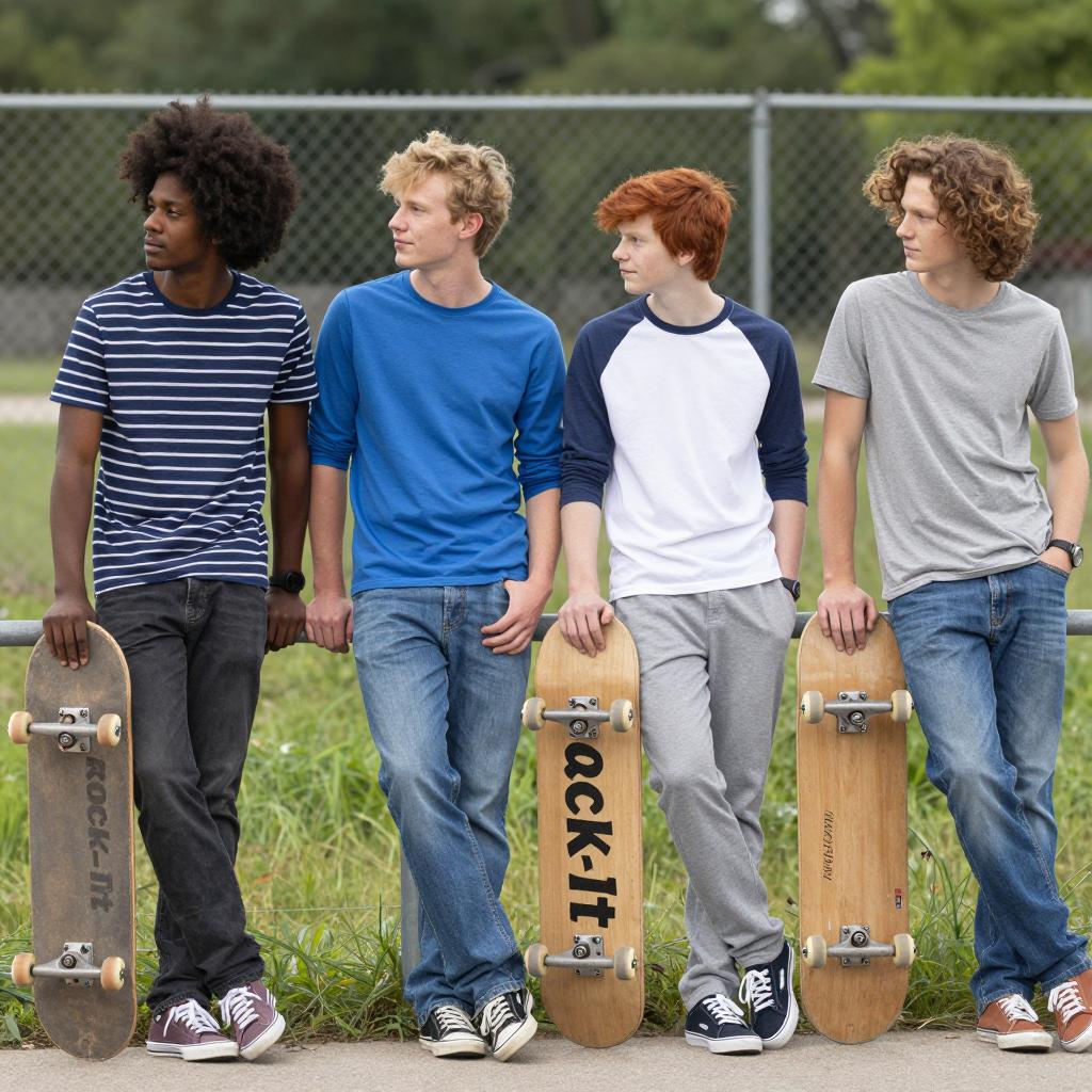 Four teenage boys lean on a metal fence, each holding a wooden skateboard with "Rock-It" written on it. From left to right: black man with afro, striped shirt, dark jeans; white man with curly hair, blue shirt, jeans; white boy with red hair, white and blue raglan shirt, grey jeans; white boy with curly hair, grey shirt, blue jeans. Grass and chain-link fence in background. All look relaxed.