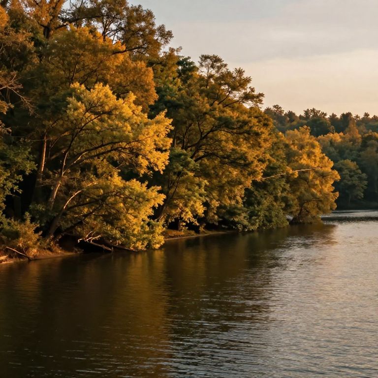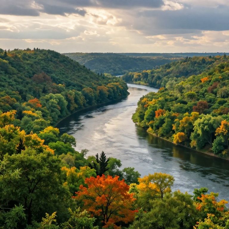 Photograph of a scenic river winding through a lush, forested valley. The river reflects the overcast sky, with patches of sunlight breaking through the clouds. Trees on either side display vibrant autumn foliage, ranging from green to bright orange and yellow. The forested hills in the background are densely packed with trees, creating a rich, textured landscape. The foreground features a mix of deciduous trees with colorful leaves. The overall composition emphasizes the natural beauty and diversity of the forest during the fall season.