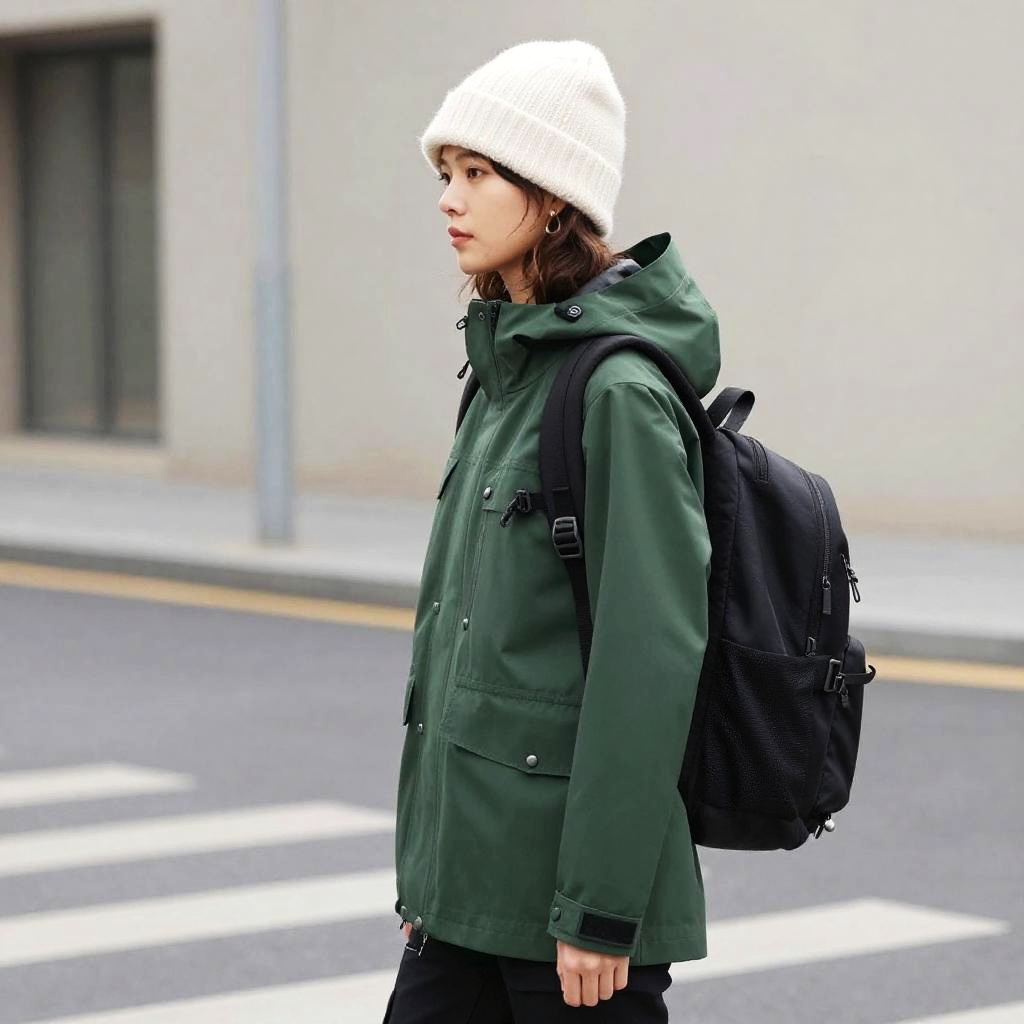 Winter Birthday Outfit, woman wearing a green jacket and a white hat and a black backpack
