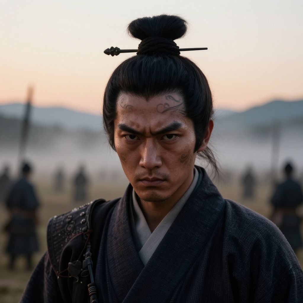 Photograph of intense, tattooed Asian warrior with black topknot, traditional dark kimono, and serious expression, blurred battlefield background at dawn.