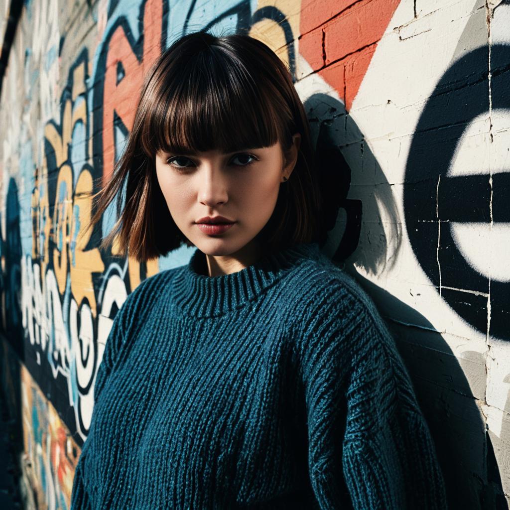 V-Cut Bangs hairstyle on young woman, wearing casual athleisurewear, in botanical garden, captured in fashion editorial style with natural golden hour glow.