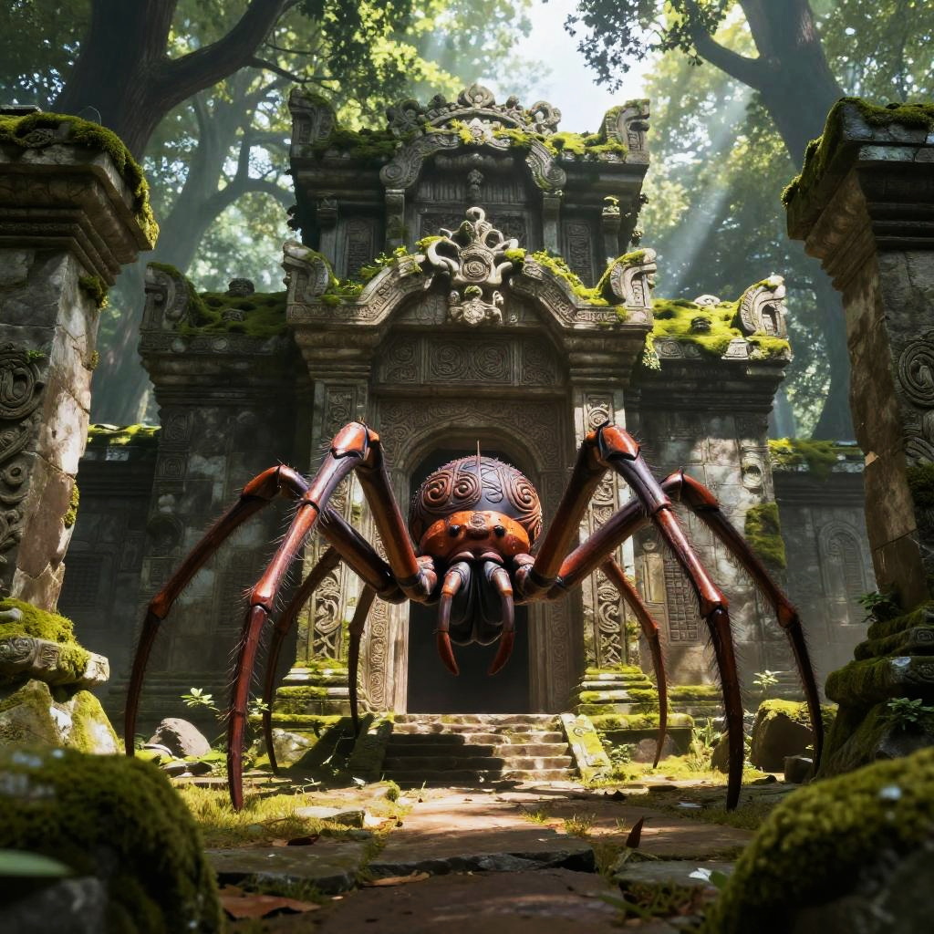 Massive spider Pokemon guarding an ancient temple, weathered stone ruins covered in moss, dramatic lighting with rays breaking through tree canopy, intricate pattern on its back, epic fantasy art