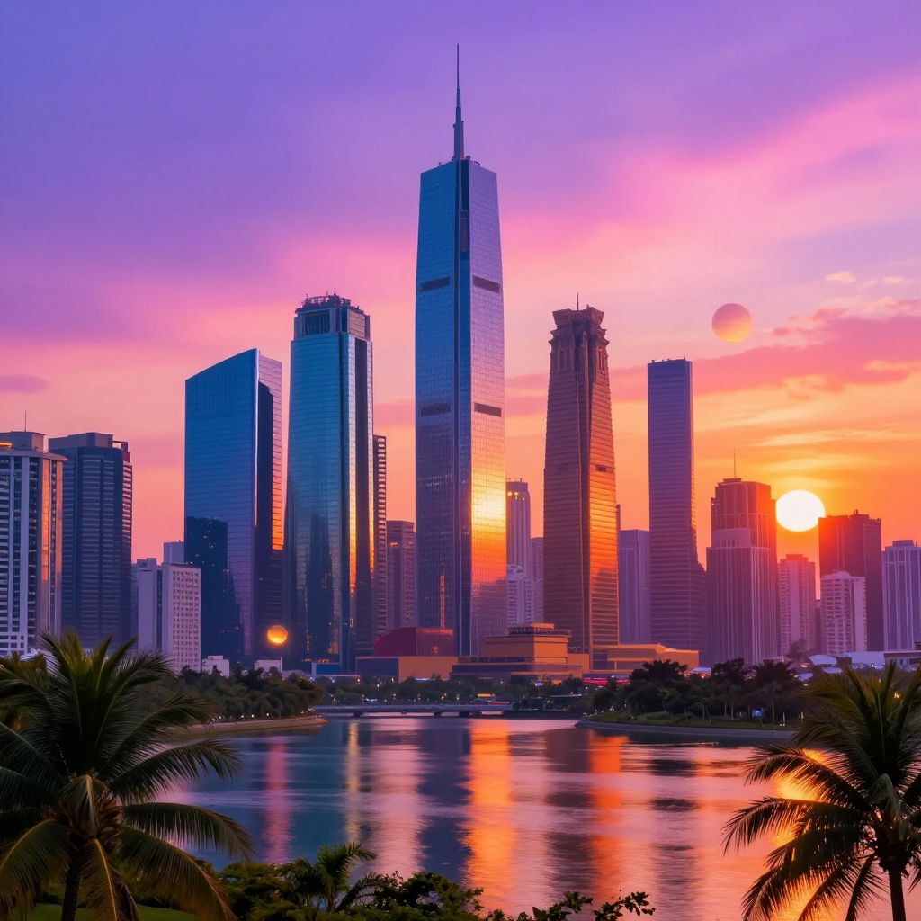 Photograph of a vibrant cityscape at sunset featuring a cluster of modern skyscrapers with reflective glass facades. The tallest building, centrally located, has a sleek, pointed spire. The sky is a gradient of purple, pink, and orange hues, with the sun partially visible on the right, casting warm reflections on the water below. Palm trees in the foreground frame the scene, adding a tropical feel. The buildings exhibit a mix of rectangular and slightly curved architectural designs, creating a dynamic cityscape. The water's surface mirrors the colorful sky and city lights.
