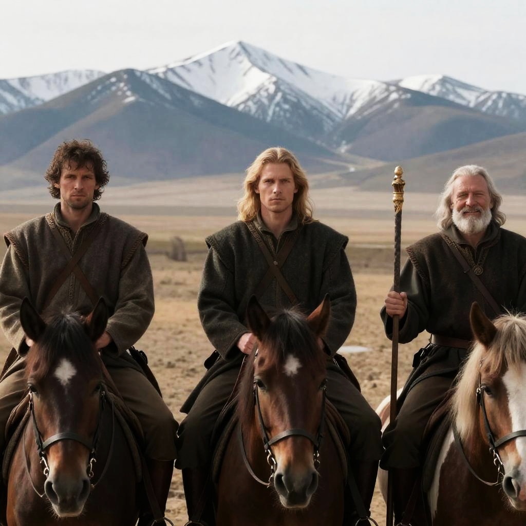 Photograph of four men in medieval-style clothing, standing in a mountainous landscape. Central figure with curly brown hair, green cloak, brown tunic, holding cloak edge. Man to left with curly blonde hair, dark cloak, yellow shirt. Man to right with blonde hair, grey cloak, brown tunic, white shirt. Fourth man partially visible, blonde hair, grey cloak. Snowy mountains in background. All men have serious expressions. Clothing ures: wool, leather. Natural light, daytime.
