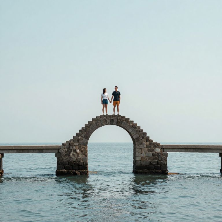 Two figures stand hand-in-hand atop a narrow stone arch suspended over a serene sea, defying gravity as the bridge seamlessly merges with the horizon, creating an impossible connection between two distant worlds.