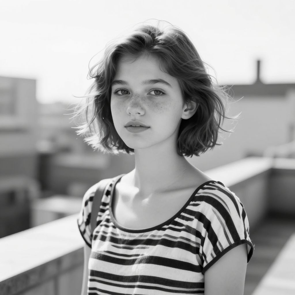 Black and white digitally illustrated portrait of an adventurous teenage Caucasian girl with short, wavy hair, standing outdoors on a city rooftop terrace. She has a calm, relaxed expression, natural freckles, and is wearing a striped black and white top. The image captures a serene summer vibe with soft natural light and a shallow depth of field blurring the urban background.