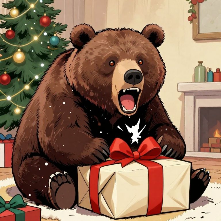 A digital illustration depicts a large, brown bear with dark fur and a light beige snout, sitting on a white rug in a cozy, festive living room. The bear has its mouth open, revealing sharp teeth, and is surprisedly unwrapping a large, cream-colored gift box with a red ribbon. To the left, a decorated Christmas tree with colorful ornaments and lights stands, while a lit fireplace with a mantel and candles is on the right. The background features wooden paneling and warm lighting, enhancing the holiday atmosphere. The bear's expression and the dynamic motion of unwrapping the gift create a sense of surprise and excitement.