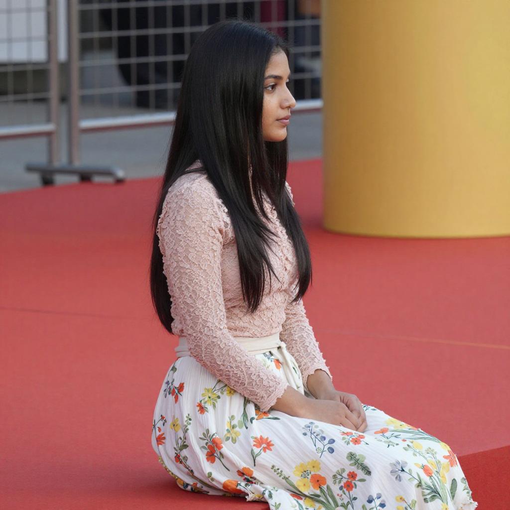Photograph of a young woman with long black hair, sitting on a red carpet in profile. She wears a pale pink, long-sleeved lace top and a white floral skirt. A yellow cylindrical object and a wire fence are in the background. Her expression is neutral, and she sits with her hands resting on her lap.