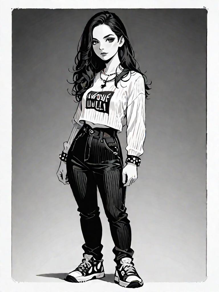 1girl, source_comics, realistic face, full body shot, Woman, casual chic, grey crewneck sweatshirt, relaxed fit, ribbed cuffs and hem, burgundy tapered leather trousers, mid-rise waist, side pockets, cropped just above the ankle, black and white checkered slip-on sneakers, layered beaded statement necklace, neutral studio background.
