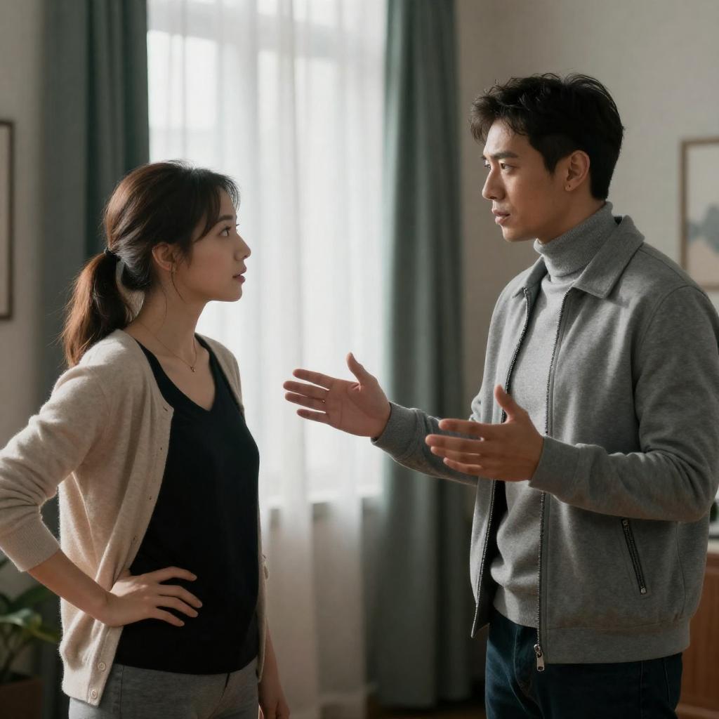 Photograph of a man and woman in an office. Man in green shirt stands behind woman, hands on hips, looking down. Woman with short brown hair, black top, eyes closed. Music sheets on desk in background, green plant to the right.