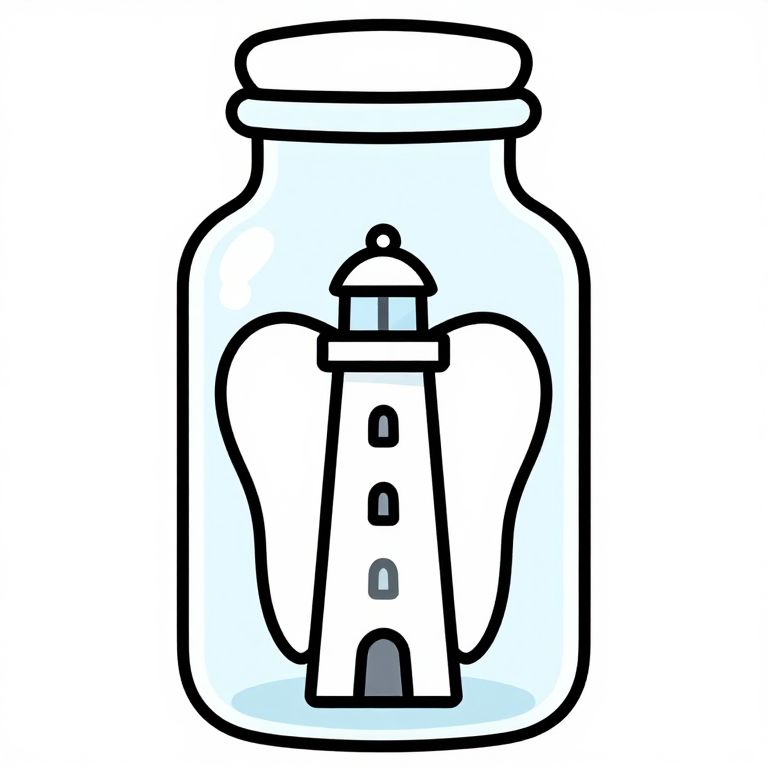 Digital drawing of a clear glass jar containing a simplified, cartoon-style lighthouse with a dome and light. Black outlines and blue shading.