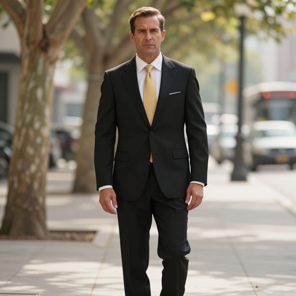 A man wearing a black suit with a white shirt and a gold tie, standing on a sidewalk with trees in the background. He has a confident posture, intense gaze, and a distinguished appearance. The scene is set in a urban environment with sunlight filtering through the trees, creating a warm and inviting atmosphere. The man's attire is crisp and well-fitted, emphasizing his formal and sophisticated demeanor. The overall image captures a moment of quiet authority and grace.