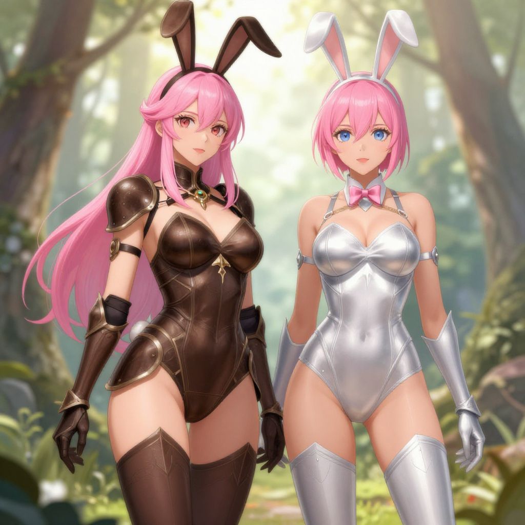Digital anime-style artwork of two pink-haired women in bunny costumes; one in black armor, the other in silver, standing in a sunlit forest.
