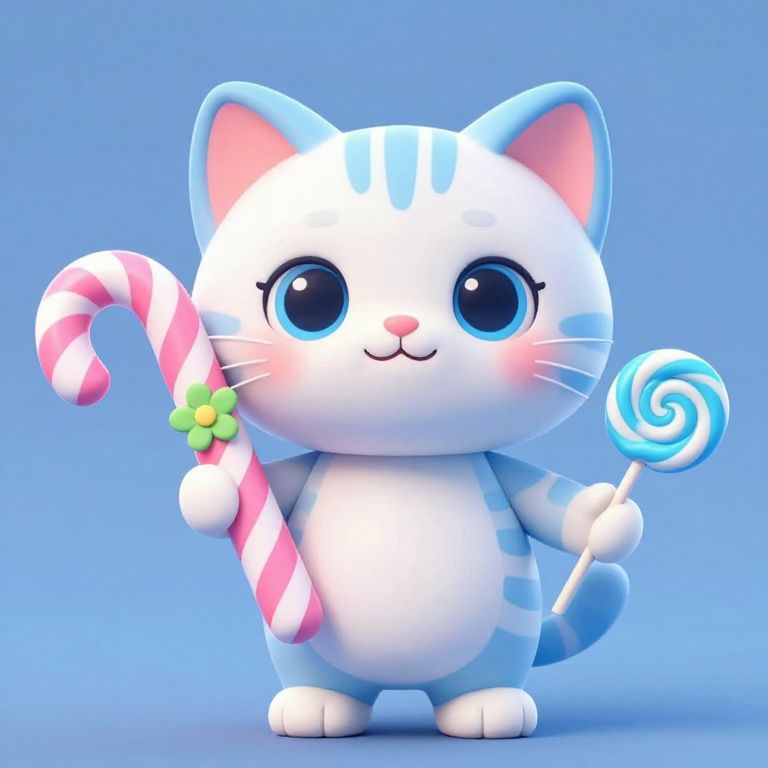 The image features a charming, 3D Pixar-style cat with a delightful pastel color scheme of white, blue, and pink. The cat has large, expressive blue eyes and a soft, rounded body with a playful, striped pattern in shades of blue and white. It is holding a large, pink and white candy cane in its left paw, which is adorned with a small green flower. In its right paw, the cat holds a smaller, blue and white swirl lollipop. The overall composition is balanced, with the cat centrally positioned and the candy cane and lollipop creating a symmetrical visual effect. The background is a solid, muted blue, which accentuates the vibrant colors of the cat and its sweet treats, creating a whimsical and inviting scene.