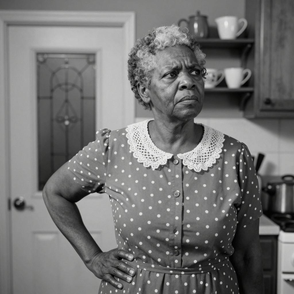 Black-and-white photograph of an older African-American woman with short, curly gray hair, wearing a polka-dotted dress with a lace collar. She stands in a kitchen, looking to the right with a serious expression. Background includes a door with a decorative glass panel, a shelf with cups, and a wooden cabinet. One hand rests on her hip.