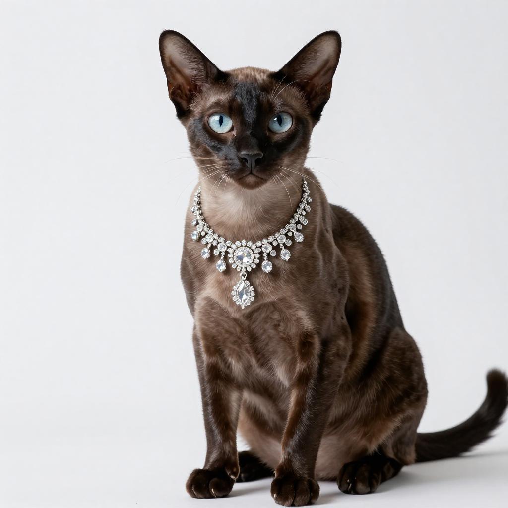 Luxurious studio portrait of a Peterbald cat sitting upright, glossy dark fur, wearing an ornate sparkling diamond necklace, clean dark background with spotlight, high-end fashion pet photography, high resolution, ultra-detailed