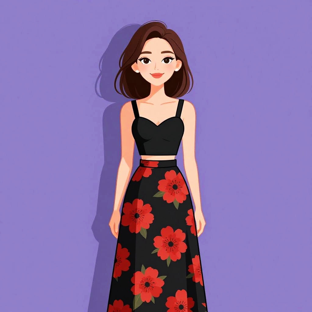 Digital illustration of a fair-skinned woman with brown hair in a black floral dress, featuring white, orange, and blue flowers, standing against a solid