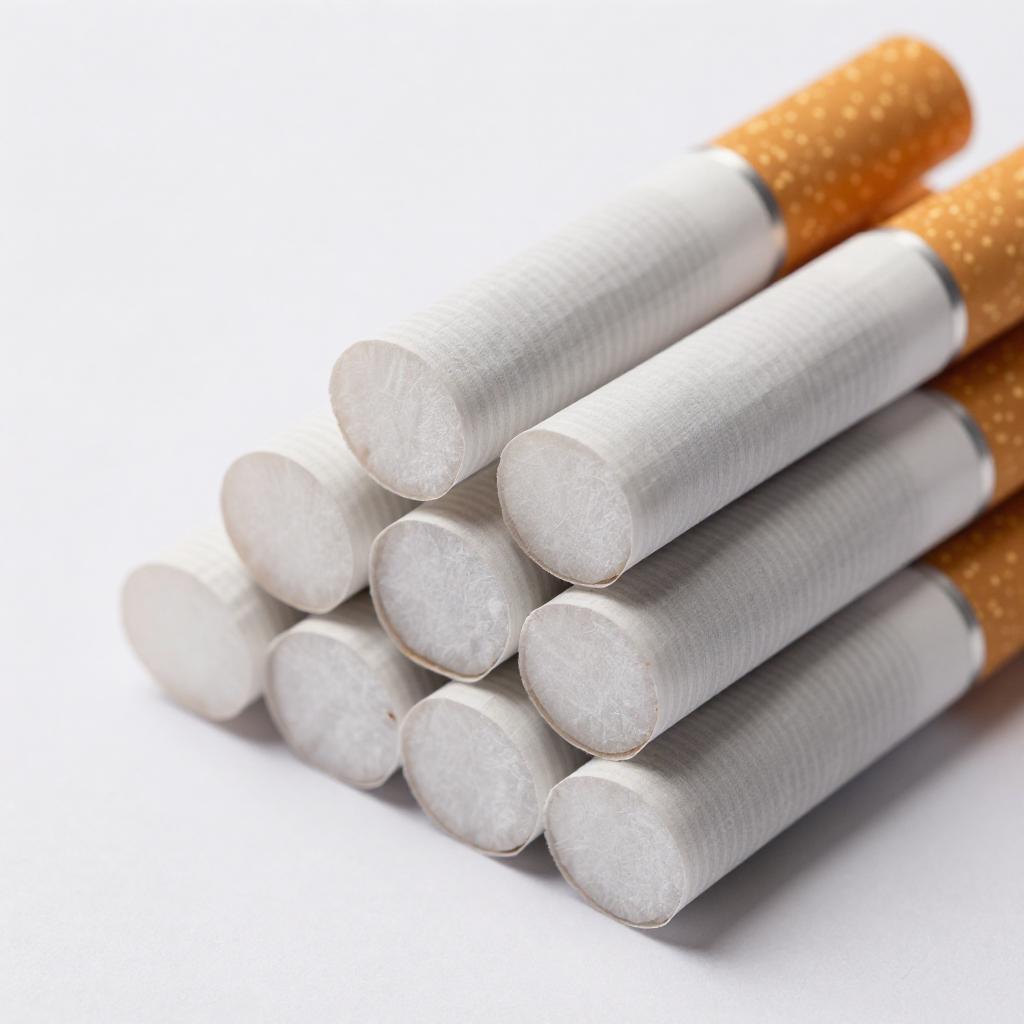 This close-up photo shows a cluster of eight cigarettes with white paper and orange-tipped filters, arranged haphazardly on a white background. The lighting is bright and even, highlighting the texture of the cigarette paper and filters. The camera angle is slightly above and to the right, with a shallow depth of field that keeps the cigarettes in focus while the background is blurred.