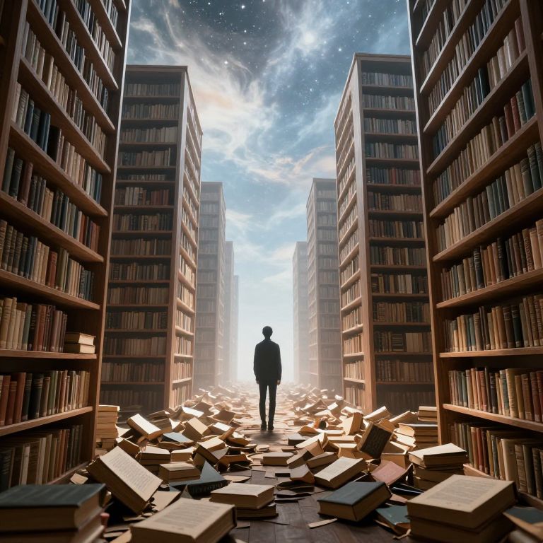 A solitary figure stands amidst an endless labyrinth of towering shelves, their path illuminated by ethereal light filtering through a celestial ceiling, as the ground beneath them crumbles into a sea of scattered, forgotten books.