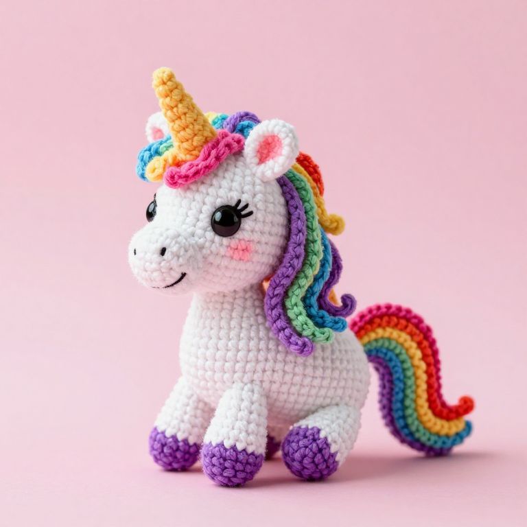 A whimsical crocheted unicorn, adorned with a vibrant rainbow mane and tail, sits serenely on a soft pink surface, embodying the enchanting charm of a mythical creature brought to life through the art of handcrafting.