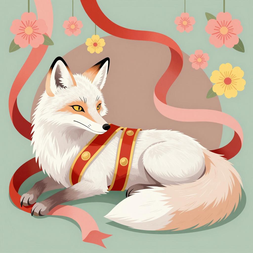 Digital illustration of a multi-tailed fox with green eyes, sitting upright. Fox has white fur on chest and face, beige fur on body, black fur on legs. Fox mask with red markings rests on right side of neck. Background is dark blue with red flowers and green stems. Fox's ears are pointed and pink inside. Fox's expression is calm. Fox's tails are large and beige, fanned out around body.