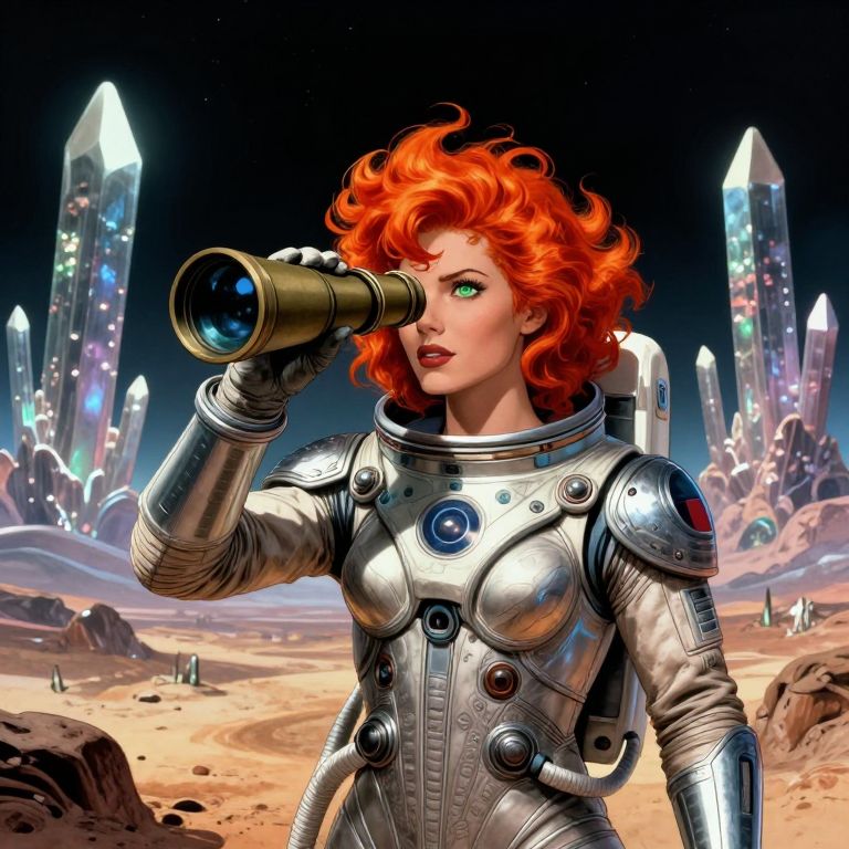 A vintage science fiction comic book illustration captures an awe-inspiring scene of a female astronaut with fiery red hair and piercing green eyes. Her spacesuit, adorned with intricate metallic patterns, stands out against the distant alien landscape. Towering crystal formations cast ethereal light across the barren terrain, evoking a sense of wonder for the unknown. The unconventional perspective, as if viewed through an antique telescope, emphasizes the dramatic lighting and vast, otherworldly expanse, drawing the viewer into this captivating scene.