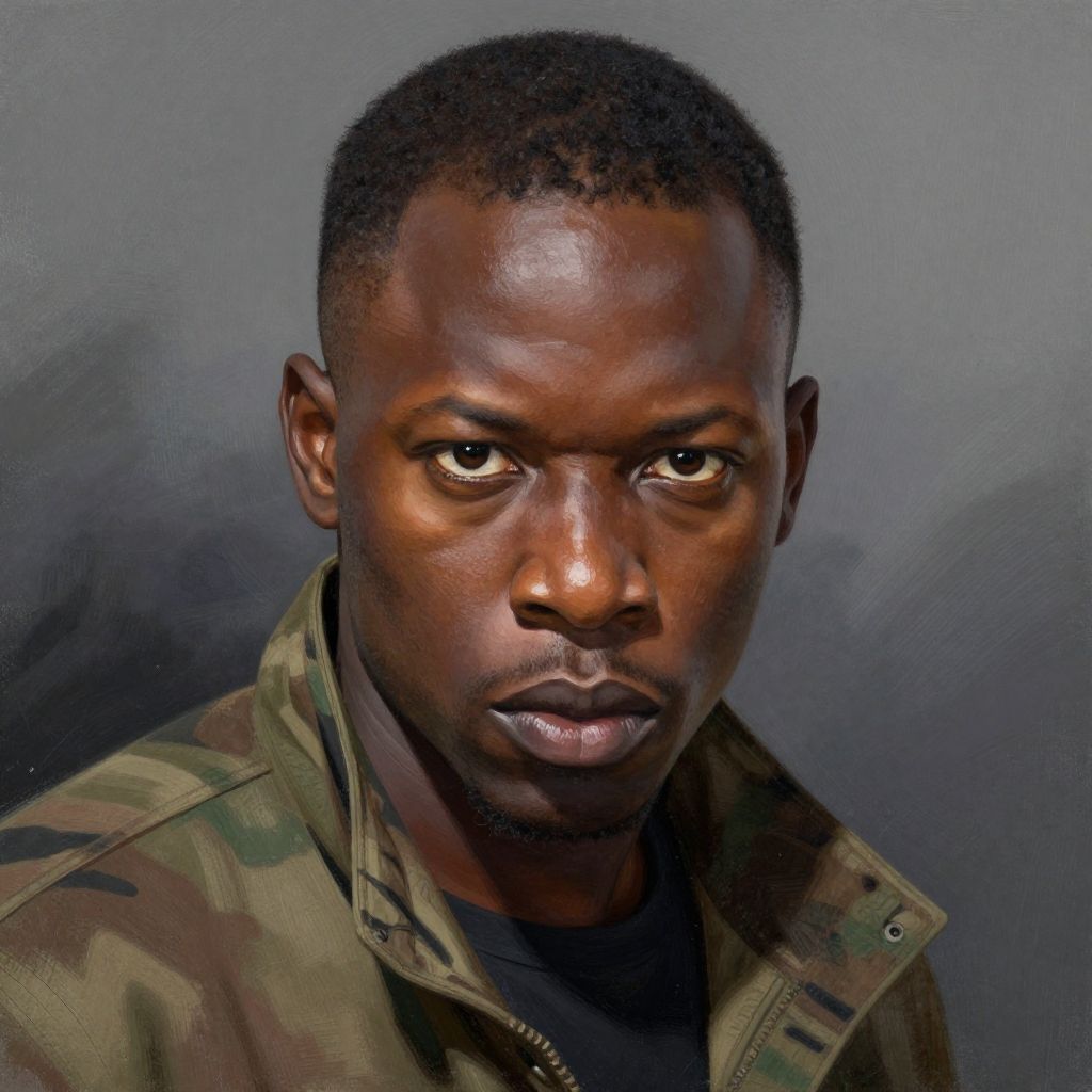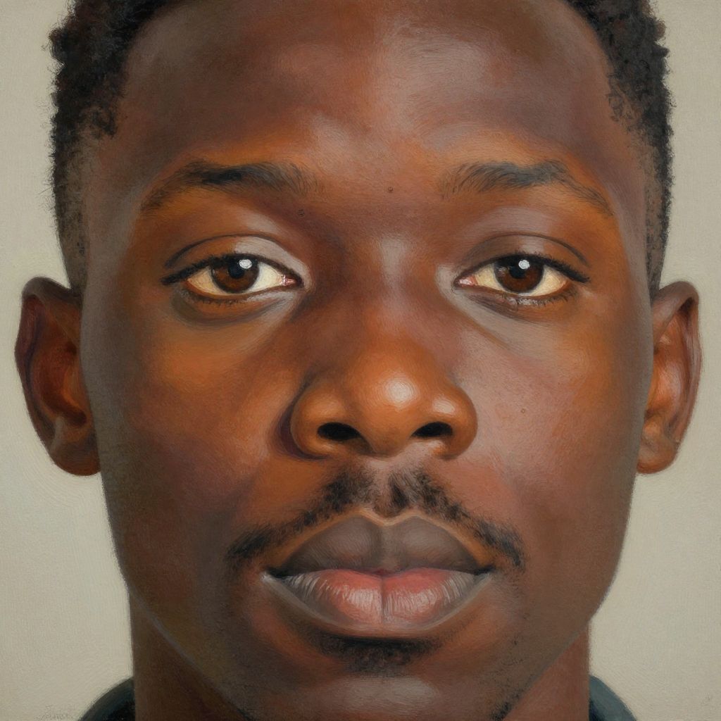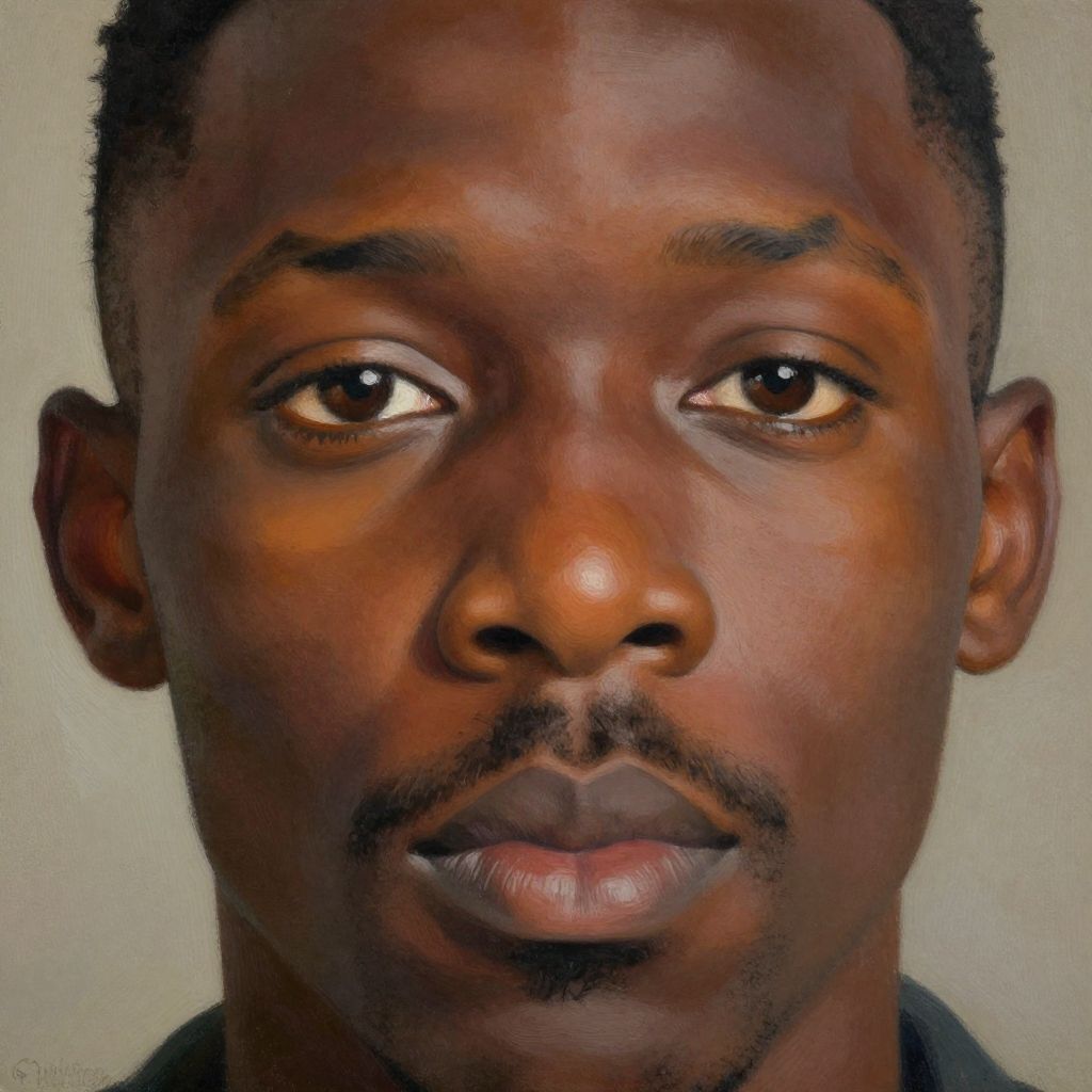 Realistic digital painting of a serious-looking Black man with dark skin, short curly hair, thin mustache, and brown eyes against a plain background.