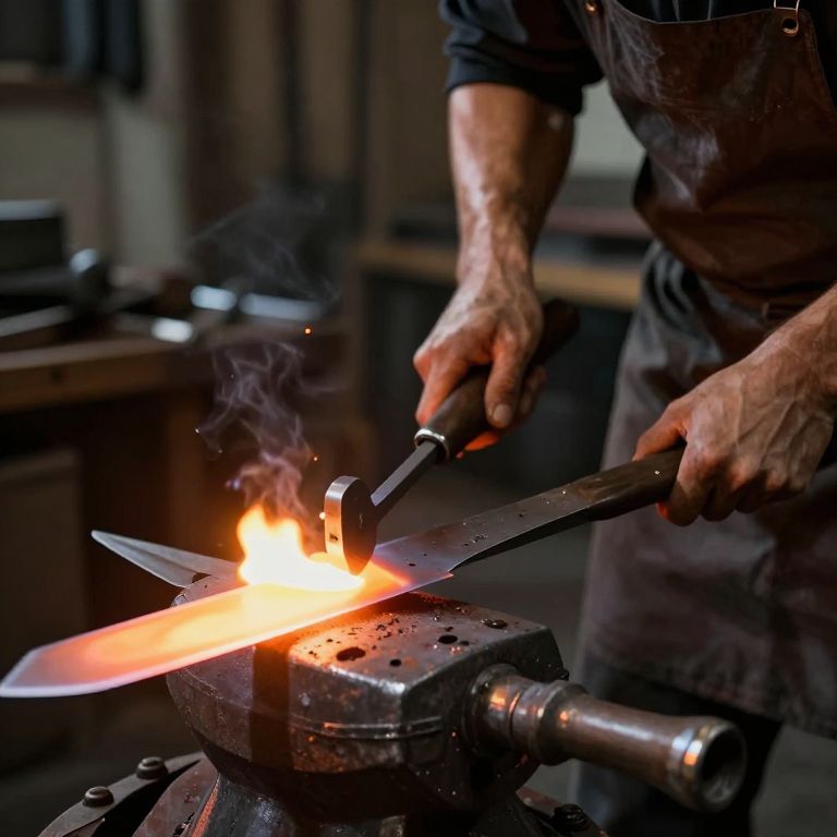 A blacksmith hammers a hot blade in a detailed, cinematic setting with Unreal Engine, showcasing hyper-realistic textures and lighting.