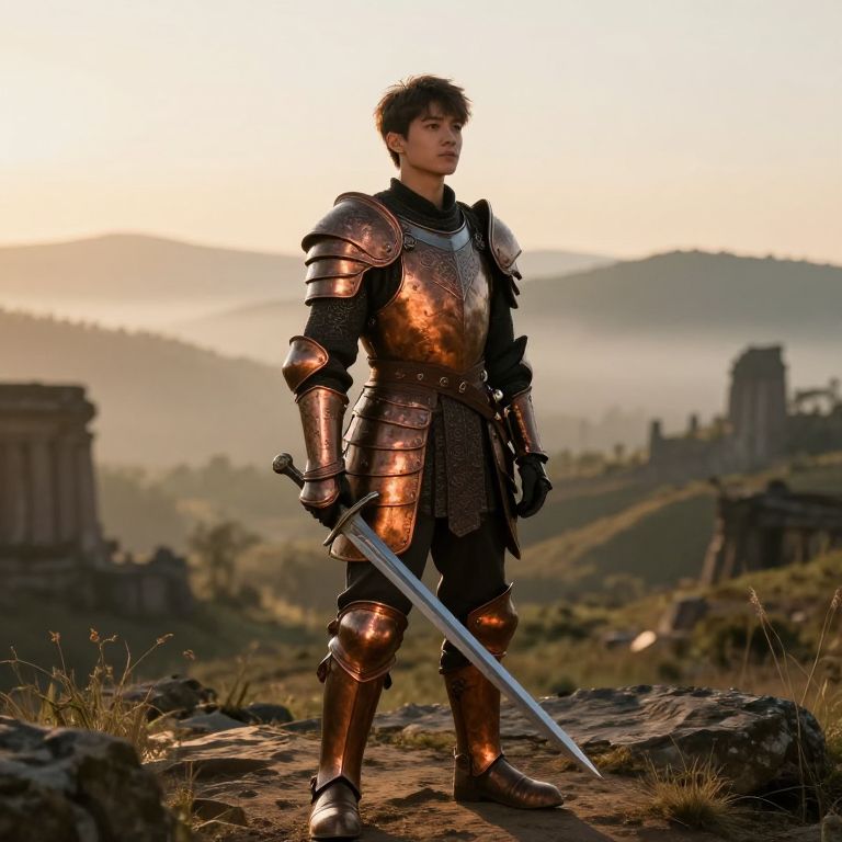 A young warrior in fantasy light armor standing at dawn, armor combining ornate copper plating and flexible leather segments, carrying a curved sword, with a backdrop of rolling misty hills and ancient ruins, soft golden light casting long shadows, heroic and hopeful vibe