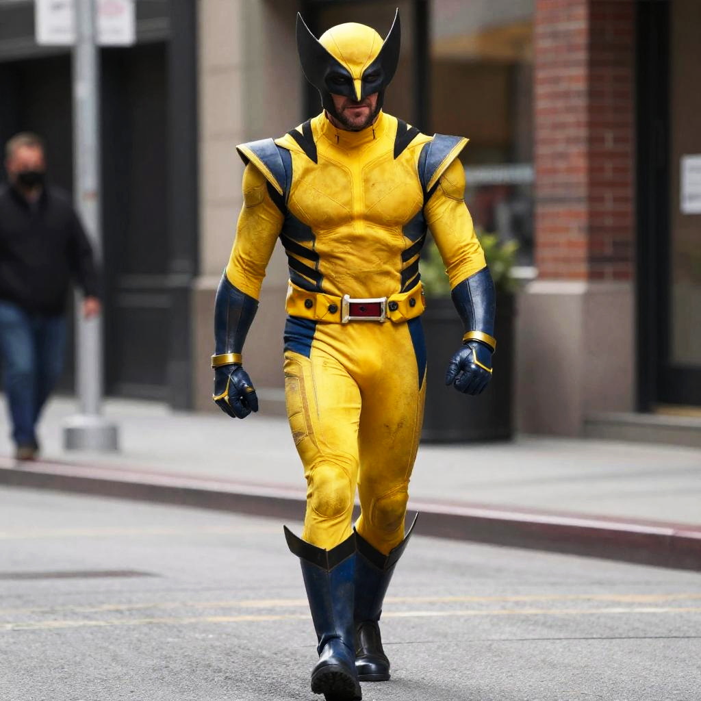 Wolverine Hugh Suit, wolverine man in a yellow and blue costume walking down a street