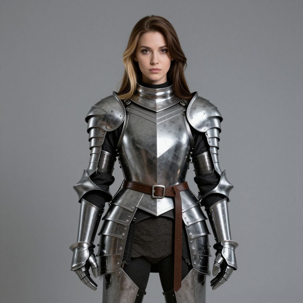 Photograph of a young woman with long brown hair, wearing shiny silver medieval armor, standing against a plain gray background.