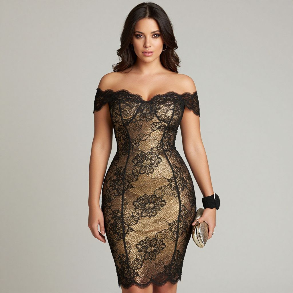 Photograph of a woman with medium brown skin and long dark brown hair, wearing an off-the-shoulder, form-fitting lace dress. The dress is black with intricate floral patterns and a gold background, highlighting her hourglass figure. She holds a small, circular, metallic clutch in her right hand and wears a black wristband on her left wrist. She stands against a plain white background, looking directly at the camera with a neutral expression. The lighting is even, emphasizing the texture of the lace and the contours of her body.