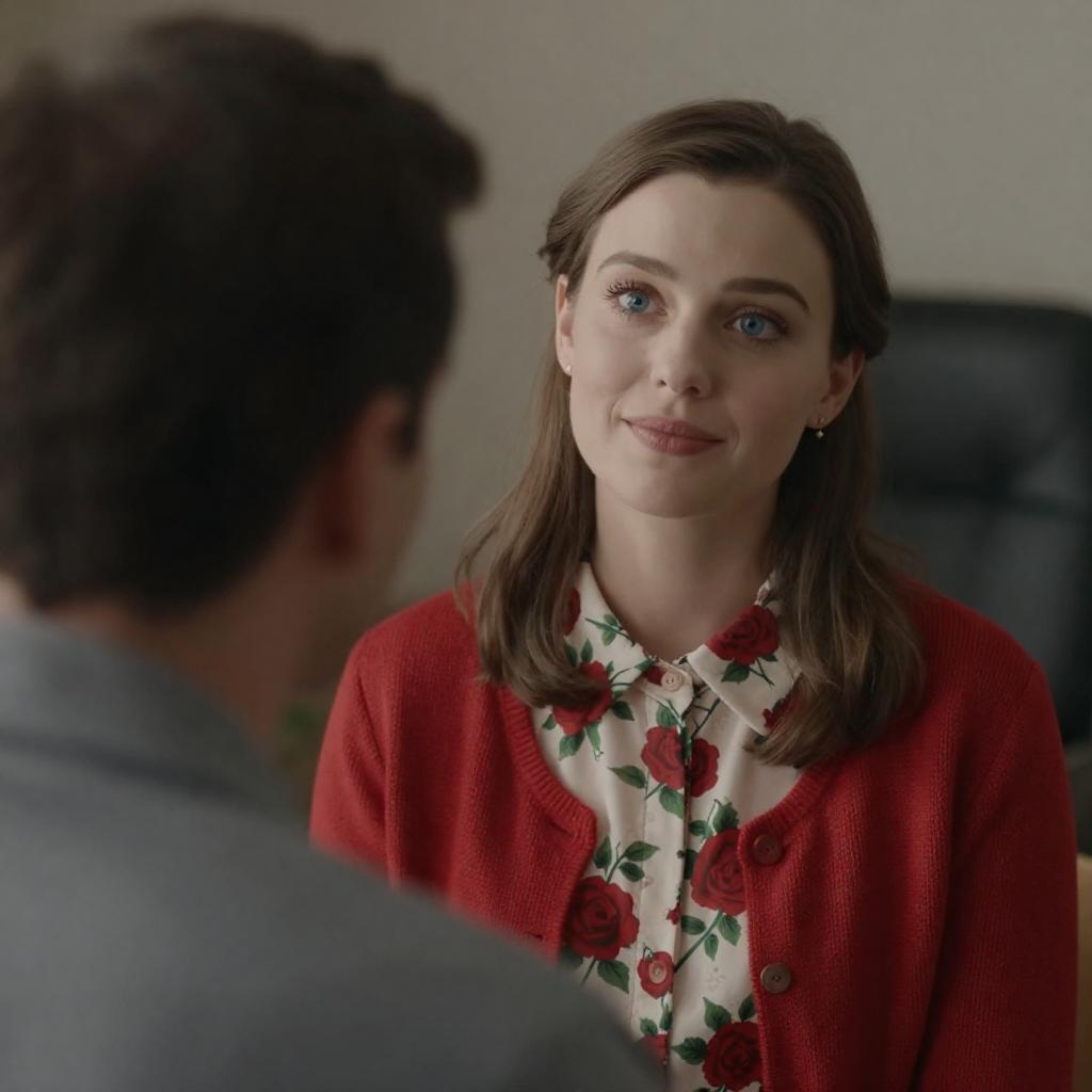 Photograph of a woman with light skin, brown hair, and blue eyes, wearing a red knitted cardigan and a floral blouse with red roses, looking up at a man with dark hair, blurred in the foreground. She has a slight smile. Background includes a dark, out-of-focus chair.