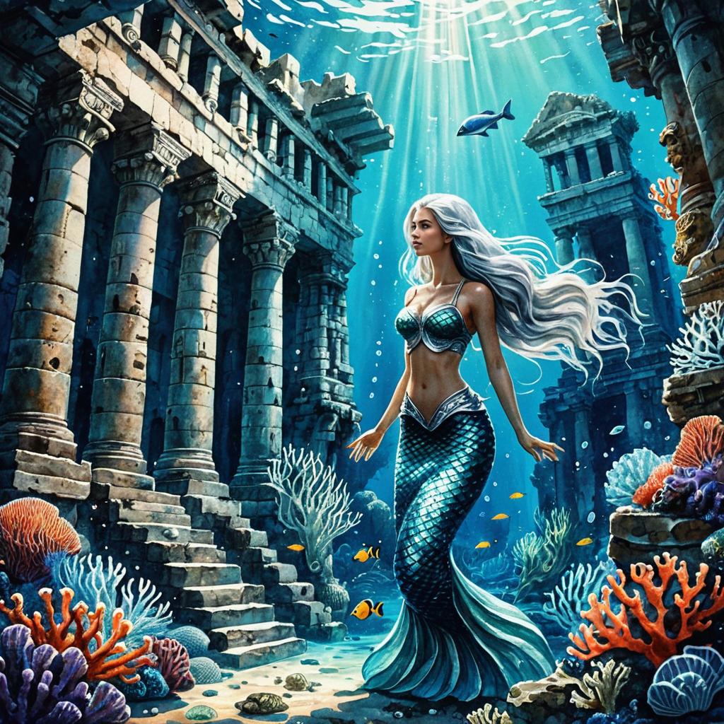 Watercolor cartoon drawing of a solemn mermaid with flowing silver hair and shining scales, set in an underwater city with ancient ruins and glowing coral reefs, exaggerated gestures, epic scenery, highly dramatic composition.