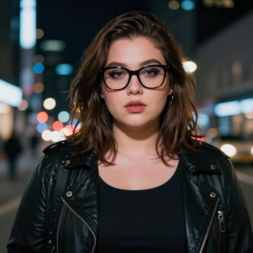 Photograph of a young woman with fair skin and shoulder-length, wavy brown hair, wearing black-framed glasses and a black leather jacket over a black top. She stands in a nighttime urban street, with blurred bokeh lights in the background, including white and red lights from cars and buildings. Her expression is neutral, and the street is dimly lit, emphasizing her face and attire. The overall style is modern and edgy, with a focus on her fashionable, slightly rebellious look. The image has a sharp focus on the subject with a softly blurred background.