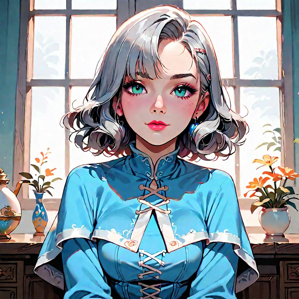 Digital art of an anime-style young woman with grey hair and blue eyes, dressed in a blue dress with frills and a capelet. She is indoors, sitting or standing in front of a large window with sunlight streaming through. The scene includes a table with decorative vases and flowers on either side of the window. The character has a slight smile and looks directly at the viewer.
