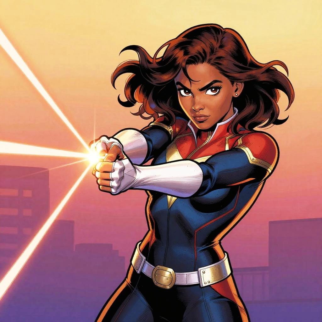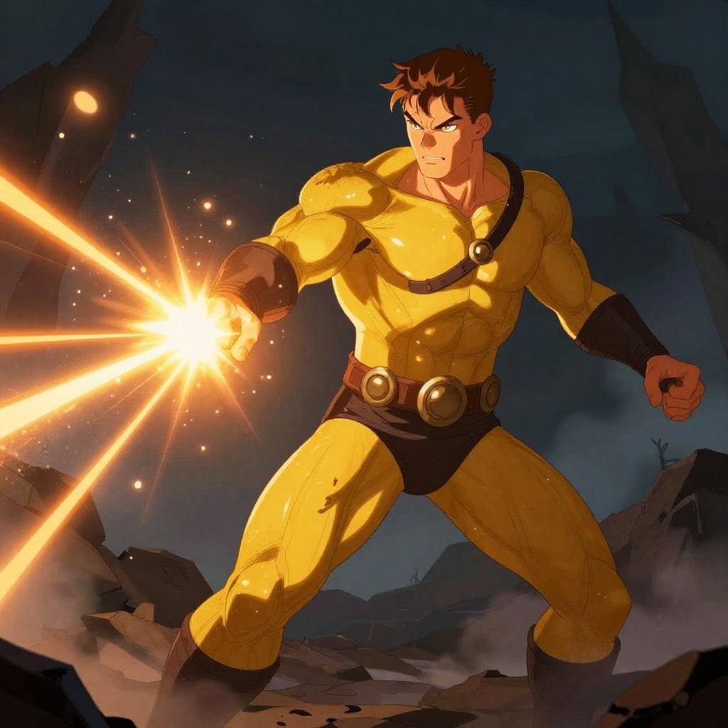 Digital illustration of a stormy scene with heavy rain and intense laser beams shooting out from a central bright light above a field. The image features dynamic light streaks and rain effects creating a high-action atmosphere.
