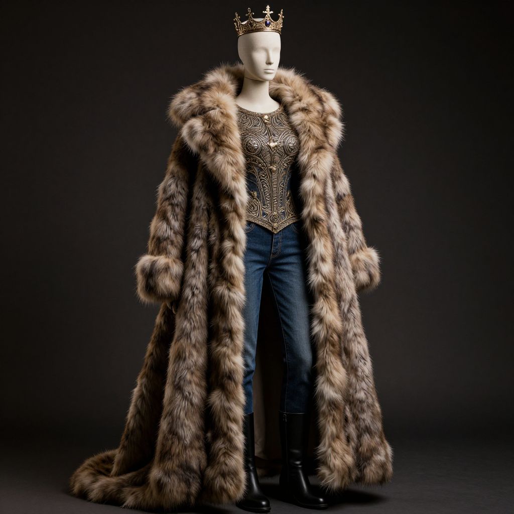 Mannequin wearing a fur coat with a crown on his head, blue jeans, and black boots, detailed, high quality, realistic, intricate textures, dramatic lighting, photorealistic, cinematic composition, elegant and mysterious, sophisticated style, intricate details, realistic textures, dramatic shadows, high-resolution, ultra-detailed, ultra-realistic, cinematic lighting, intricate patterns, elegant and mysterious, sophisticated style, intricate details, realistic textures, dramatic shadows, high-resolution, ultra-detailed, ultra-realistic