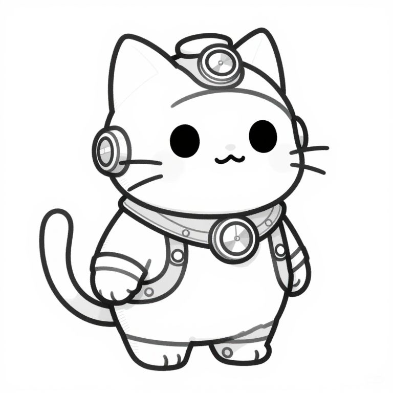 A black and white line drawing of a chibi-style, fat steampunk cat in a pixar or Disney NFT style, with a white background and black line art, no grey.